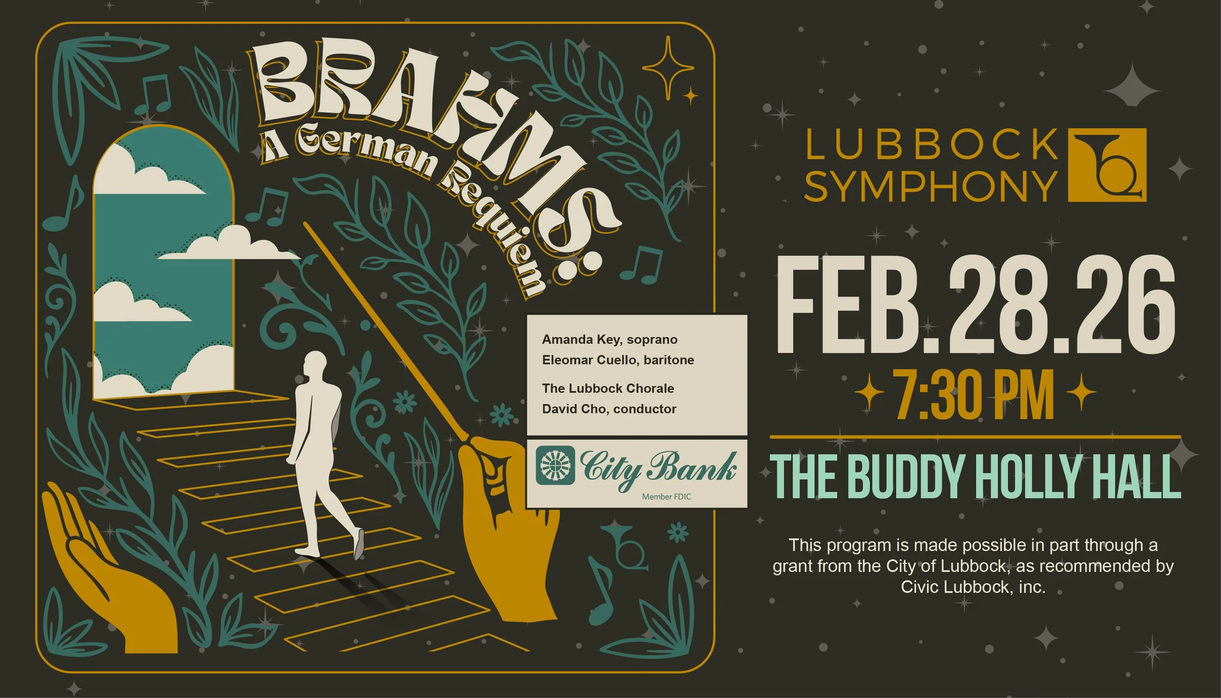 FEATURING THE LUBBOCK CHORALE: Schumann's Introduction, Scherzo, and Finale is a hidden gem in classical music. Playful, spirited, and teeming with youthful energy. In contrast, Brahms' s A German Requiem delivers an emotional meditation on life and loss, filled with soaring choral passages and sacred orchestration. Together, these works create an evening that will speak directly to your soul.