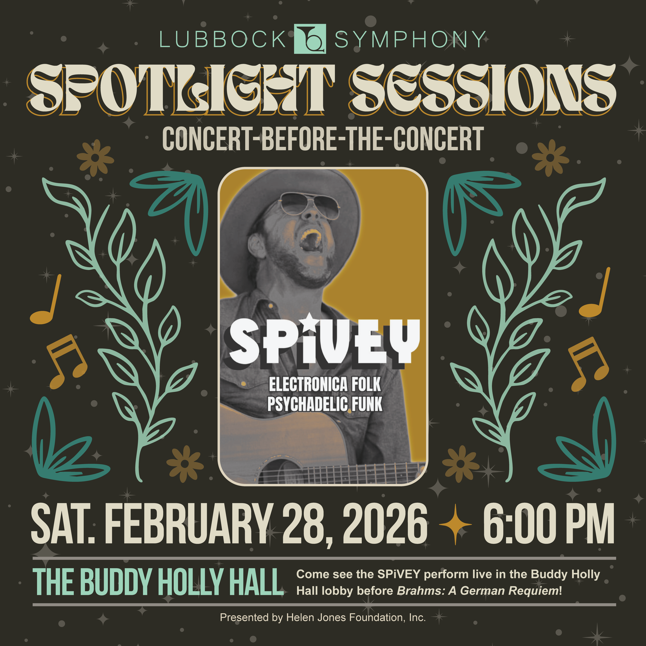 Come early for a pre-concert performance by local “Electronica Folk & Psychedelic Funk” musician SPiVEY at 6:00 PM in the lobby!