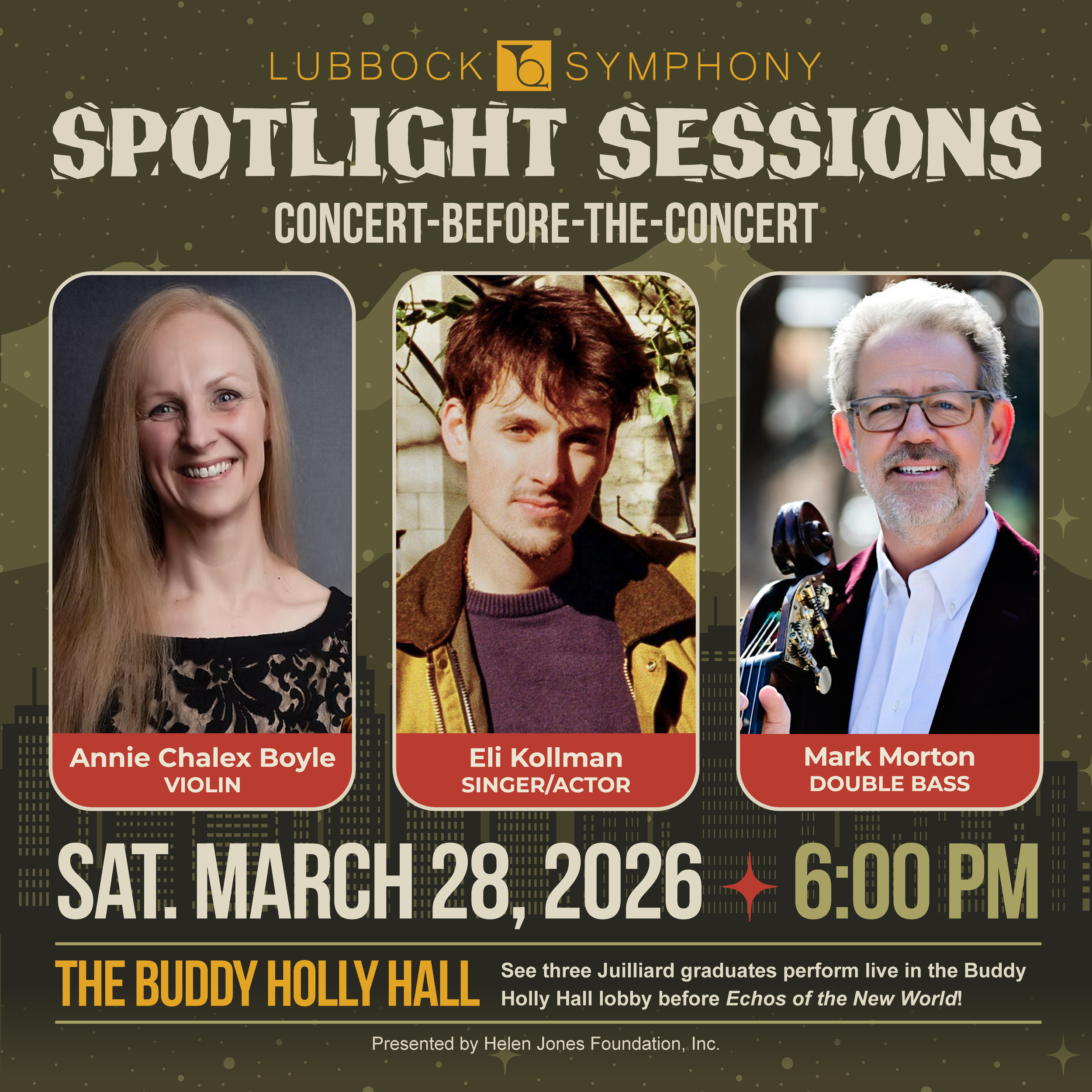 This performance is also made possible in part through The CH Foundation; Helen Jones Foundation, Inc.; The Lubbock Symphony Guild; the Texas Commission on the Arts and National Endowment for the Arts; and a grant from the City of Lubbock, as recommended by Civic Lubbock, Inc.